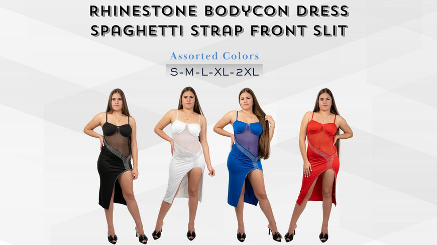 Chicaluv Wholesale - Women’s Rhinestone Bodycon Dress – Spaghetti Strap Front Slit