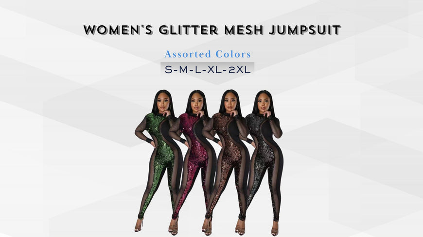 Chicaluv Wholesale - Women's Glitter Mesh Jumpsuit – Shiny Sequin Bodycon Long Sleeve Club Outfit XV946