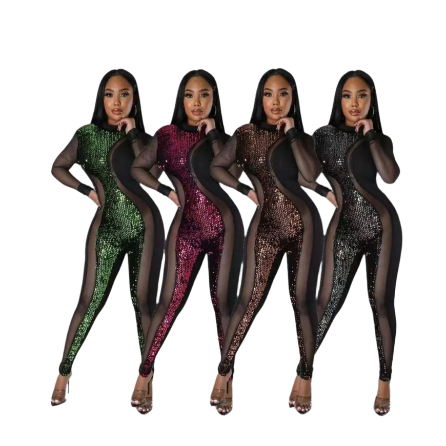 Chicaluv - Women's Glitter Mesh Jumpsuit – Shiny Sequin Bodycon Long Sleeve Club Outfit XV946