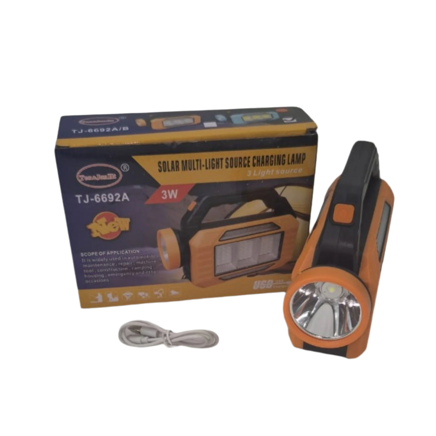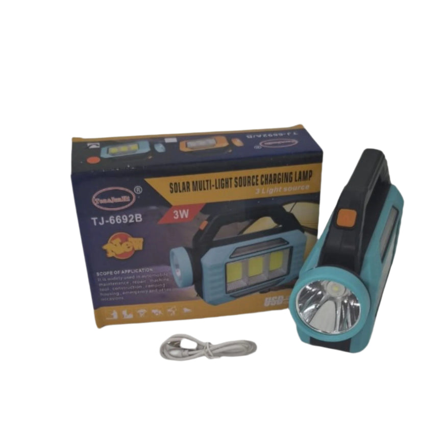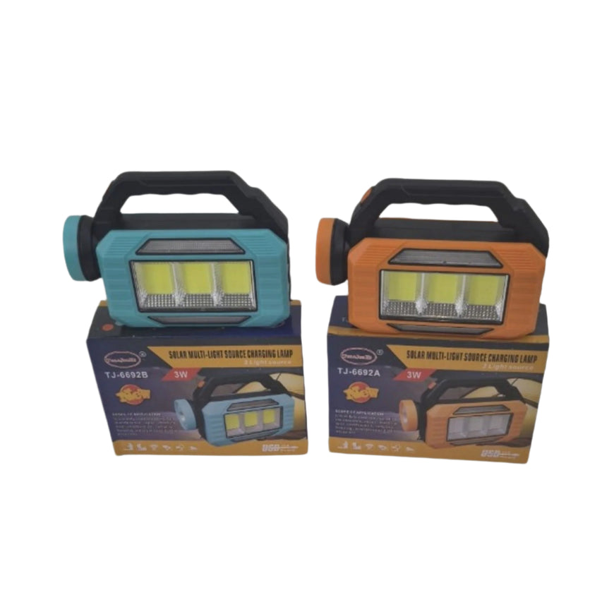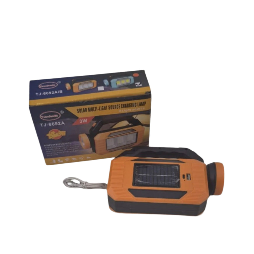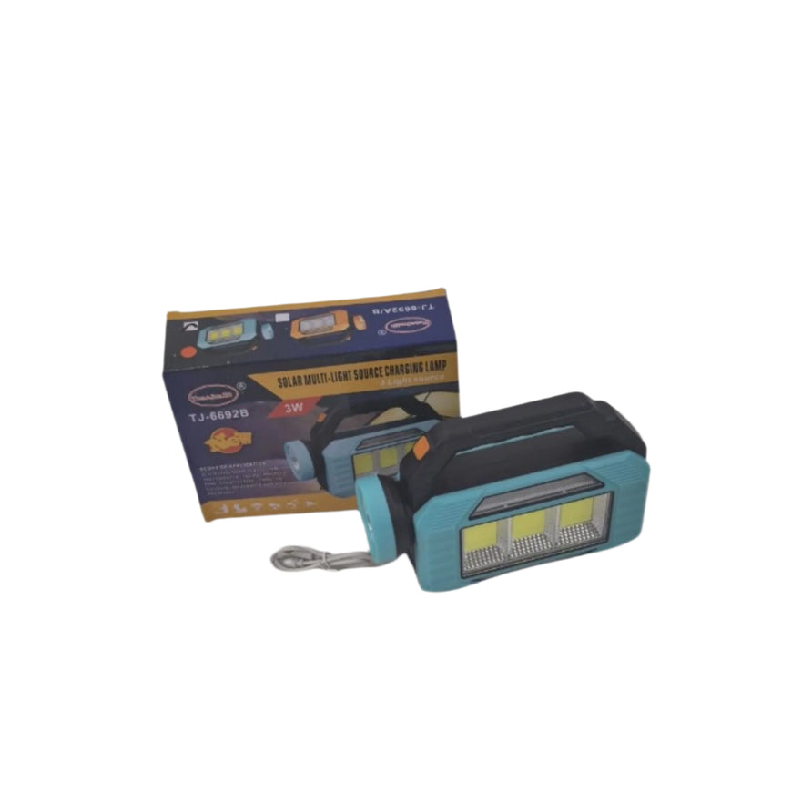 Stay prepared on the go with this 3W Solar Multi-Light Source Charging Lamp, engineered for convenience and functionality. Designed with bright LED front panels and a focused side spotlight, it delivers powerful illumination in any setting. The built-in solar panel and USB charging port offer dual power options, while its sturdy handle ensures easy portability. Lightweight yet rugged, it's ideal for camping, emergency kits, household repairs, and more.