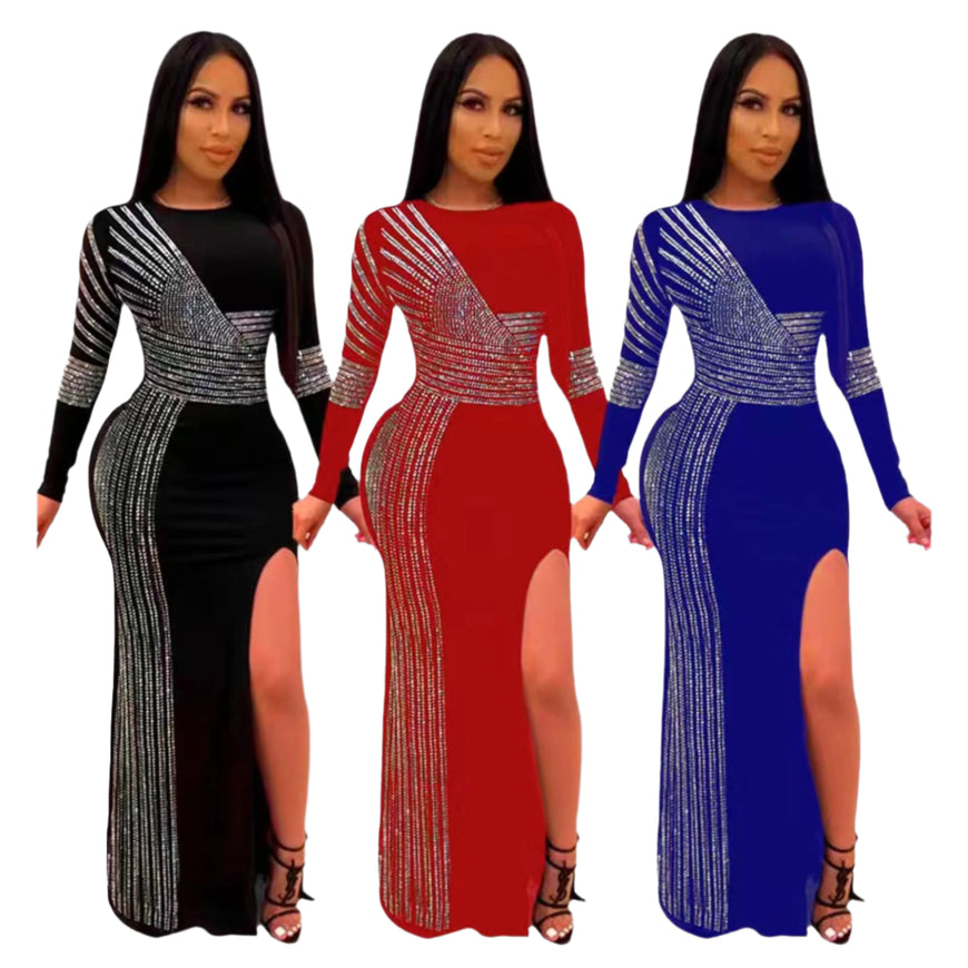 Chicaluv - Women’s Bodycon Formal Long Sleeve High Split Rhinestone Party Evening Dress