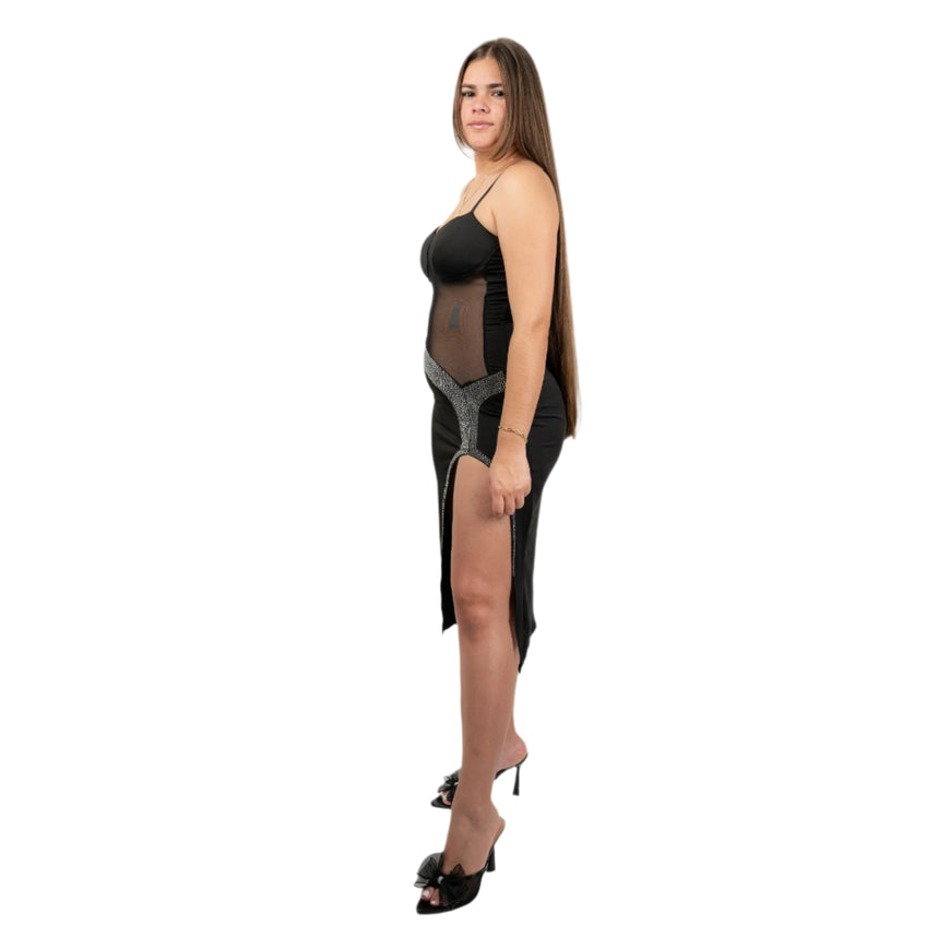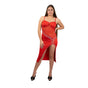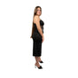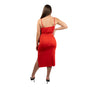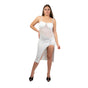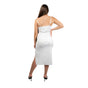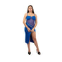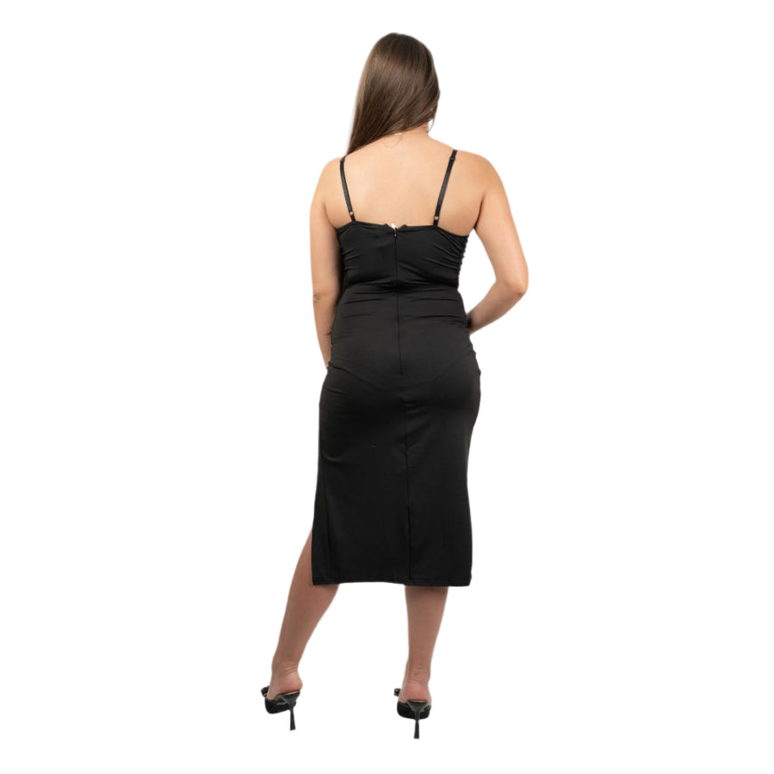 The noodle strap design adds a touch of sultry sophistication, while the front slit enhances the allure, offering a glimpse of leg that elevates the look. Crafted from premium stretch fabric, it ensures a comfortable, curve-accentuating fit. The knee-length hemline strikes the perfect balance between classy and sexy, making it ideal for special occasions.